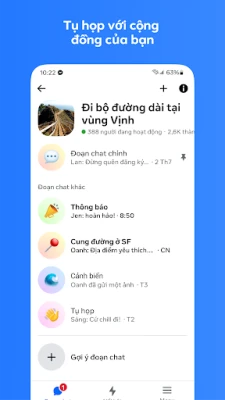 Messenger còn là nơi xây dựng và nuôi dưỡng các cộng đồng, từ bạn học cũ đến những người có chung sở thích, giúp bạn kết nối sâu sắc hơn. Luôn cập nhật thông tin mới nhất từ những người sáng tạo nội dung yêu thích thông qua các kênh thông báo độc quyền. Thỏa sức thể hiện bản thân với Meta AI, biến ý tưởng thành ảnh hoặc hoạt ảnh sống động, và chia sẻ những khoảnh khắc đời thường qua Tin hoặc Ghi chú – các nội dung này sẽ tự động biến mất sau 24 giờ. Thêm vào đó, tùy chỉnh không gian chat bằng kho chủ đề phong phú, từ nghệ sĩ đến các dịp lễ, và làm cho mỗi cuộc trò chuyện trở nên độc đáo với nhãn dán động, GIF và cảm xúc. Với Messenger, mỗi tương tác đều là một trải nghiệm được cá nhân hóa, tiện lợi và đầy cảm xúc.