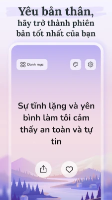 Khẳng định Hàng Ngày: Động Lực giúp bạn dễ dàng đưa những lời khẳng định tích cực vào cuộc sống. Ứng dụng này mang đến nguồn động lực mạnh mẽ, nuôi dưỡng tình yêu bản thân, giúp bạn xây dựng tư duy lạc quan và tích cực mỗi ngày.